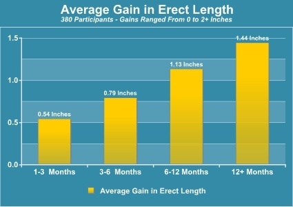 A major goal of the Jelq Device Study was to find out how users gained over time. The chart below shows the average gains experienced by Jelq device users, over a period of use from one to 12+ months.